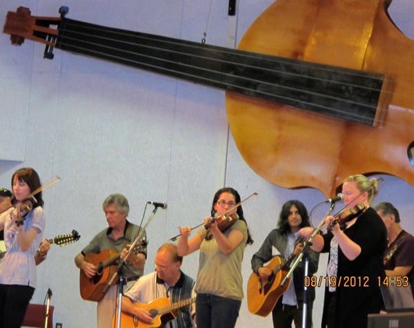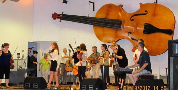The fiddler above is Shelly Campbell at the Baddeck Gathering on Tuesday, August 21, 2012. She is very friendly, as are most of the Cape Breton Islanders, and says she is ready to come to Asheville. The step dancer is a walk-on and one of the best we saw. The accompanist is Alan Dewar who is Music Director at the Judique Center, and accompanied Natalie McMaster on tour from 2000 - 2006; he likely played the Porter Center with her when she performed there.