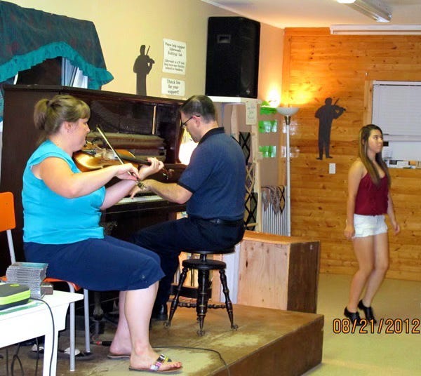 As I said in an earlier post, we attended our first Ceilidh at The Baddeck Gathering. Jennifer Bowman was on the upright piano accompanying fiddler Donna Marie DeWolfe (and serving as musicologist for the tourists in the crowd). That was our introduction to up close Cape Breton fiddle and to Donna Marie who took up the fiddle 7 years before (at the age of 10) and she can really play. She has a wonderful sound and is very athletic - the heel and toe slapping of her leather sandals amount to a four piece rhythm section.