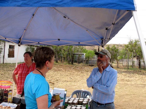 Our friends Mark Foster and Deb Tout in Alpine, Texas, have helped to organize a thriving farmers market in Alpine and assisted with a city wide celebration of Earth Day on Saturday. Deb is an administrator at Sul Ross State University in Alpine and Mark is an organic farming guru and promoter. He produces commercial quantities of organic vegetables, condiments and eggs on less than 1 acre of rocky Chihuahuan Desert soil just south of Alpine. It is relatively cold in the winter, blistering in summer, zero per-cent humidity, and an average annual rainfall of only 10 inches. Gardening there is like gardening on Mars compared to the garden spot of western North Carolina. He writes a weekly newsletter and a column in the Big Bend Gazette monthly newspaper. He manages the Red Wagon Farm newsgroup on Yahoo, and waters veggies all night.