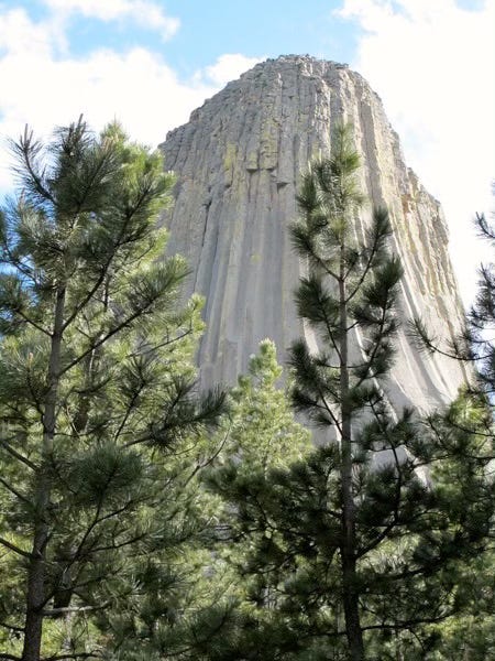 Bear Lodge (Lakota: "Matho Thipila") (European American: "Devil's Tower") is an igneous intrusion soaring 1267 feet straight up above the surrounding terrain along the Belle Fourche River Valley. Many of our fellow visitors that day were rock climbers with their ropes and gear. We hiked all the way around the base and we could see the climbers like ants on the tower - some a thousand feet above the ground - straight down.