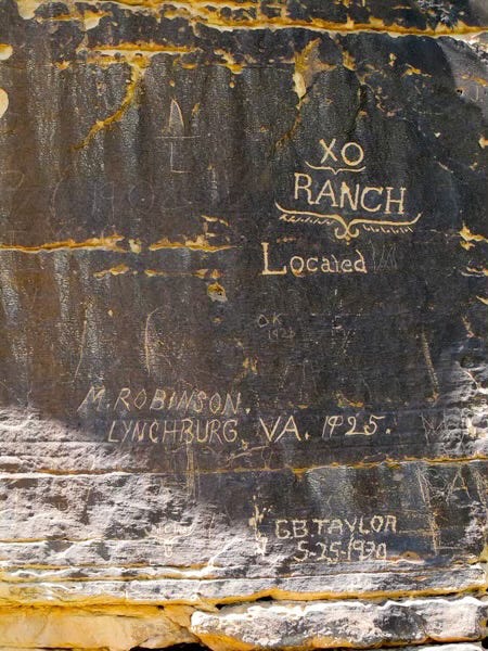 European American petroglyphs at Black Hills Wild Horse Sanctuary photographed during the short bus tour. The Cox Family Ranch was purchased by the founder, Dayton Hyde, and added to the Sanctuary. I am hazy on the tour guide's story regarding this petroglyph. There are famous XO Ranches from Texas to Idaho but I can't tie this brand to the Cox Family Ranch although it seems reasonable.