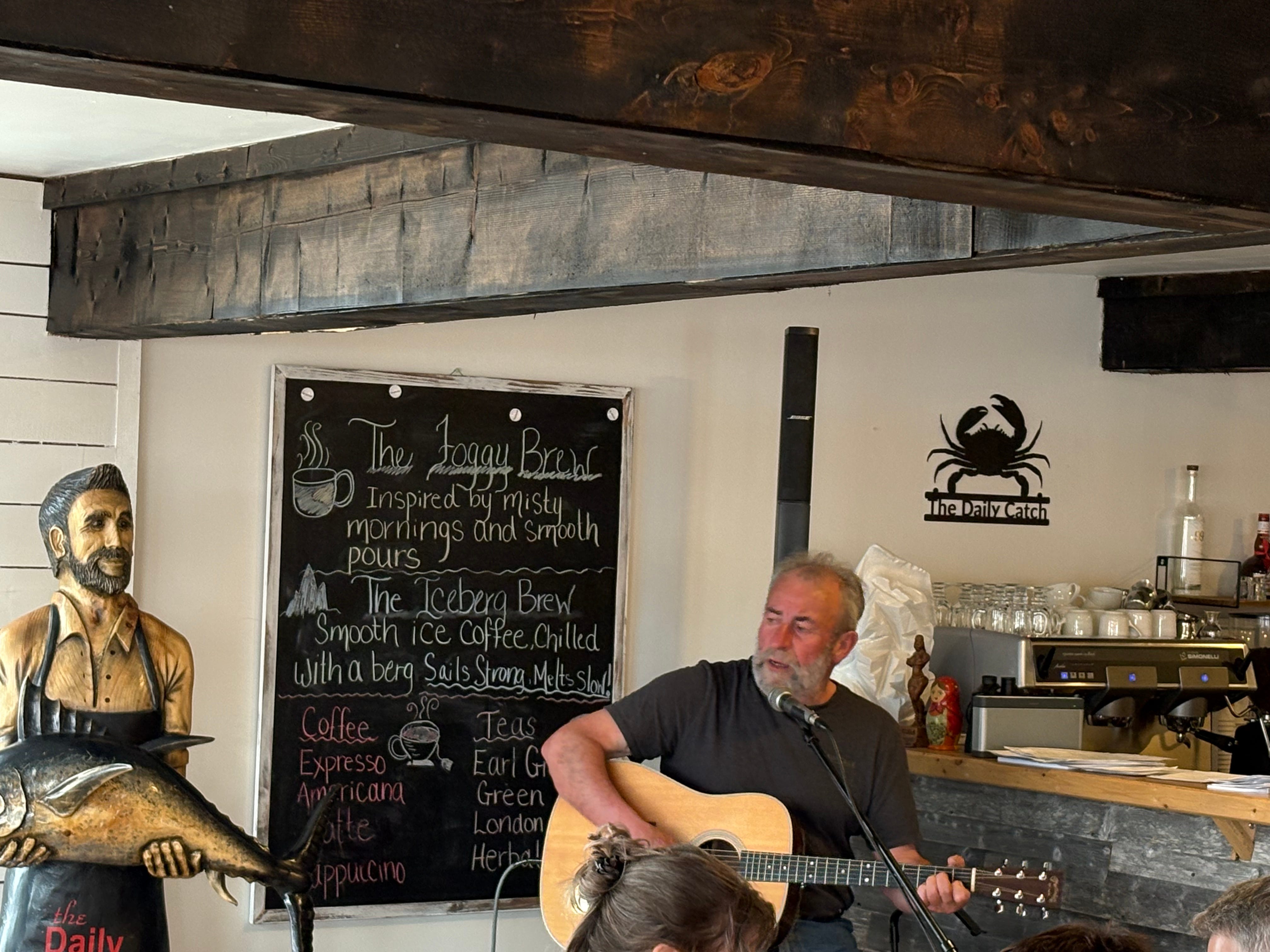 Wade Hillier I met when he played acoustic guitar and squeezebox at The Daily Catch in St. Lunaire-Griquet on an evening soon after my arrival. I learned that although he plays the Newfoundland folk anthem (Sonny’s Dream) and others by Ron Hynes, he really is a country music fan and does John Cash (voice and guitar) more correctly than John ever did. I tried to interest him in Ian Tyson (Summer Wages) and others in the crowd really worked on him for some Gordon Lightfoot. But to no avail — “Sonny’s Dream” and “Ring of Fire” and, regrettably, “Sitting on the Dock of the Bay” was what we got in the end. Wade is a good performer and a really good musician.