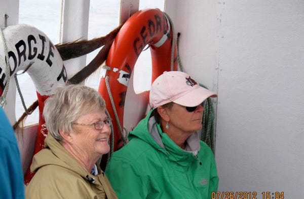 While we waited to be served, Tanne was “working the room” and at the next table she found Heather, who graduated from high school with her, 50 years before, and then moved away and made her life in Wisconsin. We had a delightful 50-year reunion visit with Heather and her husband, and that continued in the afternoon onboard the Georgie Porgie for the whale-watching tour.