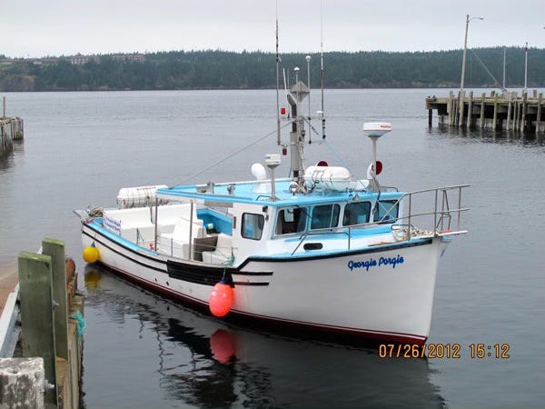 The Georgie Porgie arrived at the dock and disembarked the folk from the morning tour. The tour boat is a working lobster boat during lobster season and becomes a whale-watching tour boat when lobster season closes (locally May 31). Captain Tim Crocker runs the boat, exchanging information and sightings with other boats, while the passengers are entertained and informed by a knowledgeable local guide.