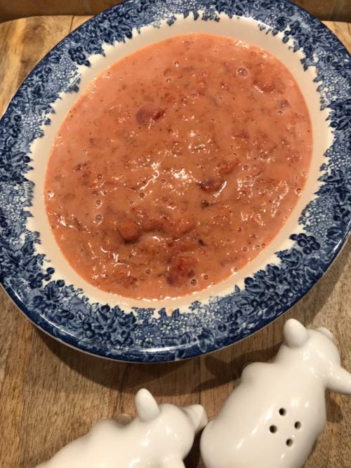 The grandchildren referred to this as “Tomato Gravy.” Jim remembers that it contained “copious” black pepper.